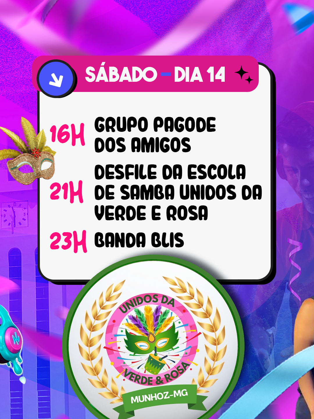 ⏰ 21h – Desfile da Escola de Samba Unidos da Verde e Rosa.